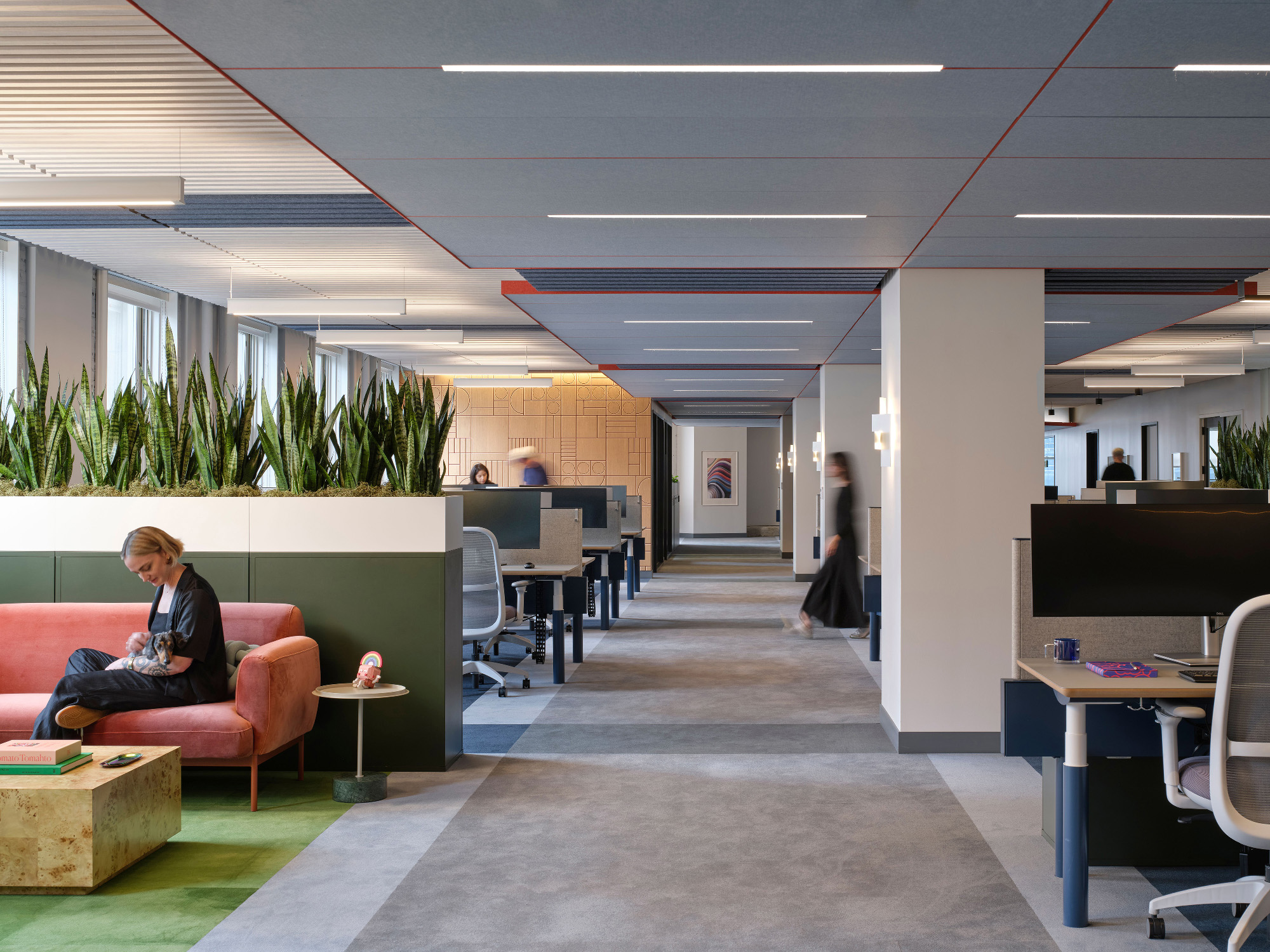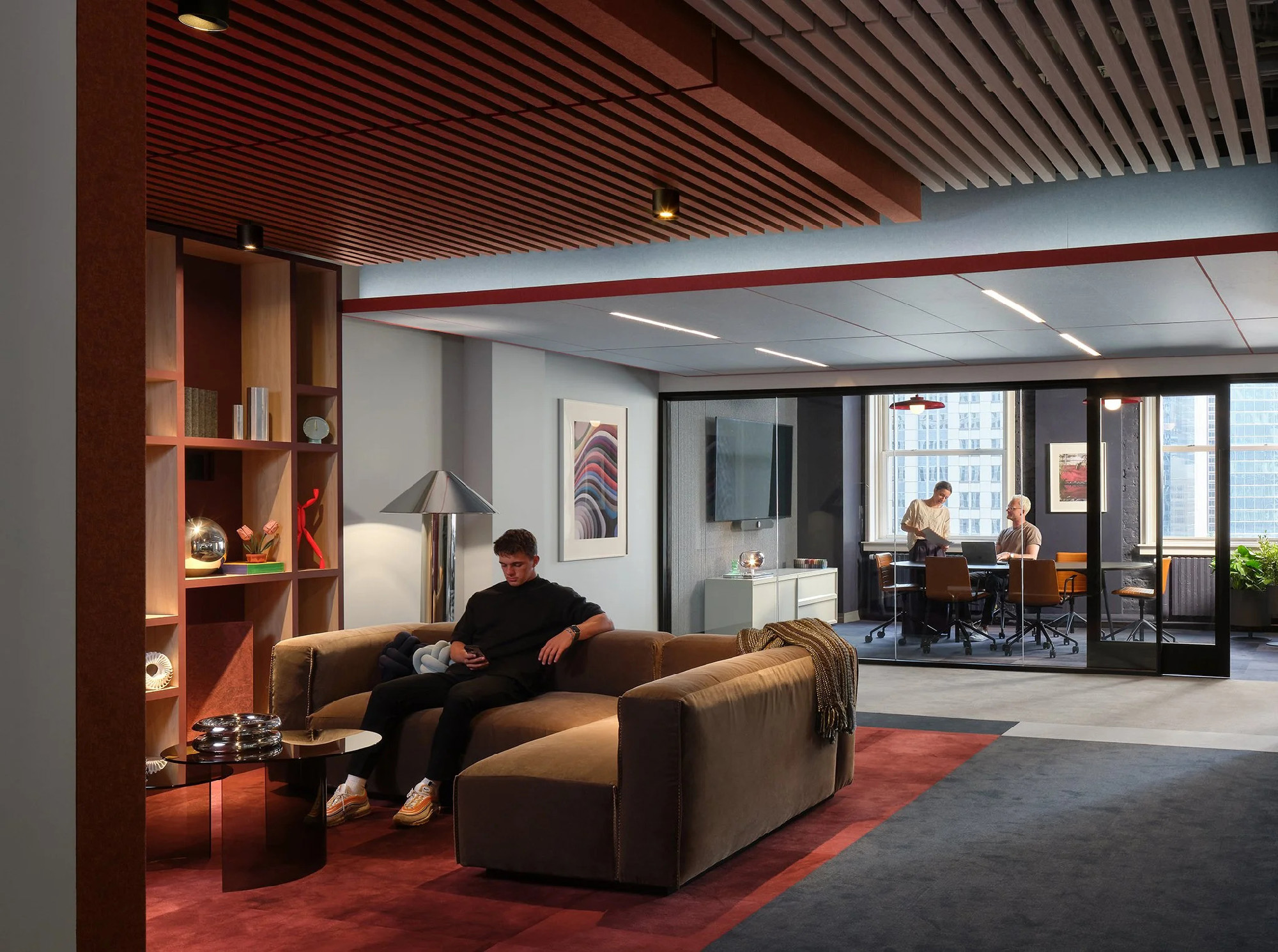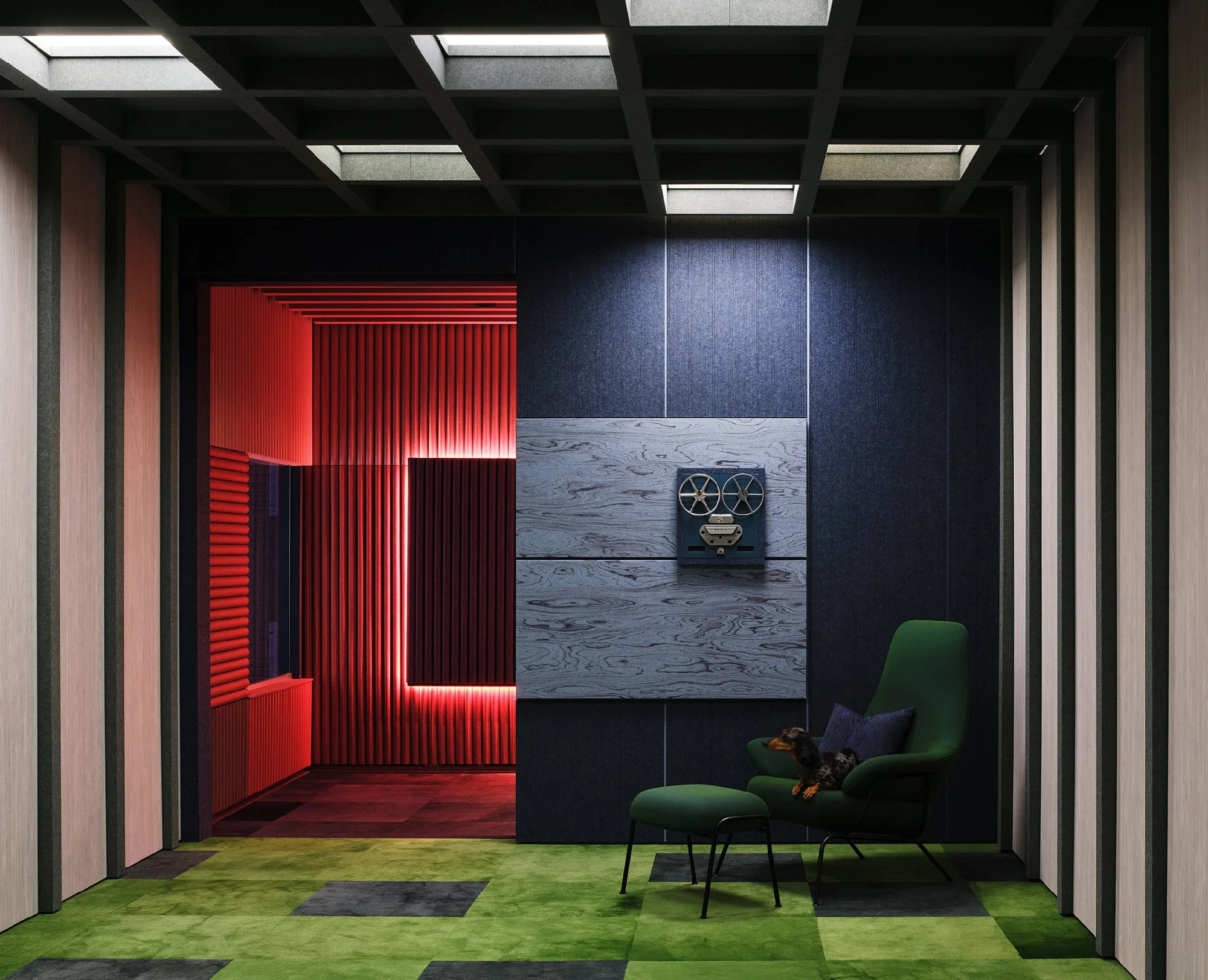 Turf 新总部空间的设计将多元工作方式与员工关怀置于首位。这一理念通过从明亮活力区到深邃静谧区的空间光谱得以实现。三处风格迥异的休闲区作为工作、休憩或交谈的休憩之所:深邃静谧的“Merlot Lounge”、明亮活力的“Green Lounge”,以及更具私密感又不失能量的“Groovy Lounge”。