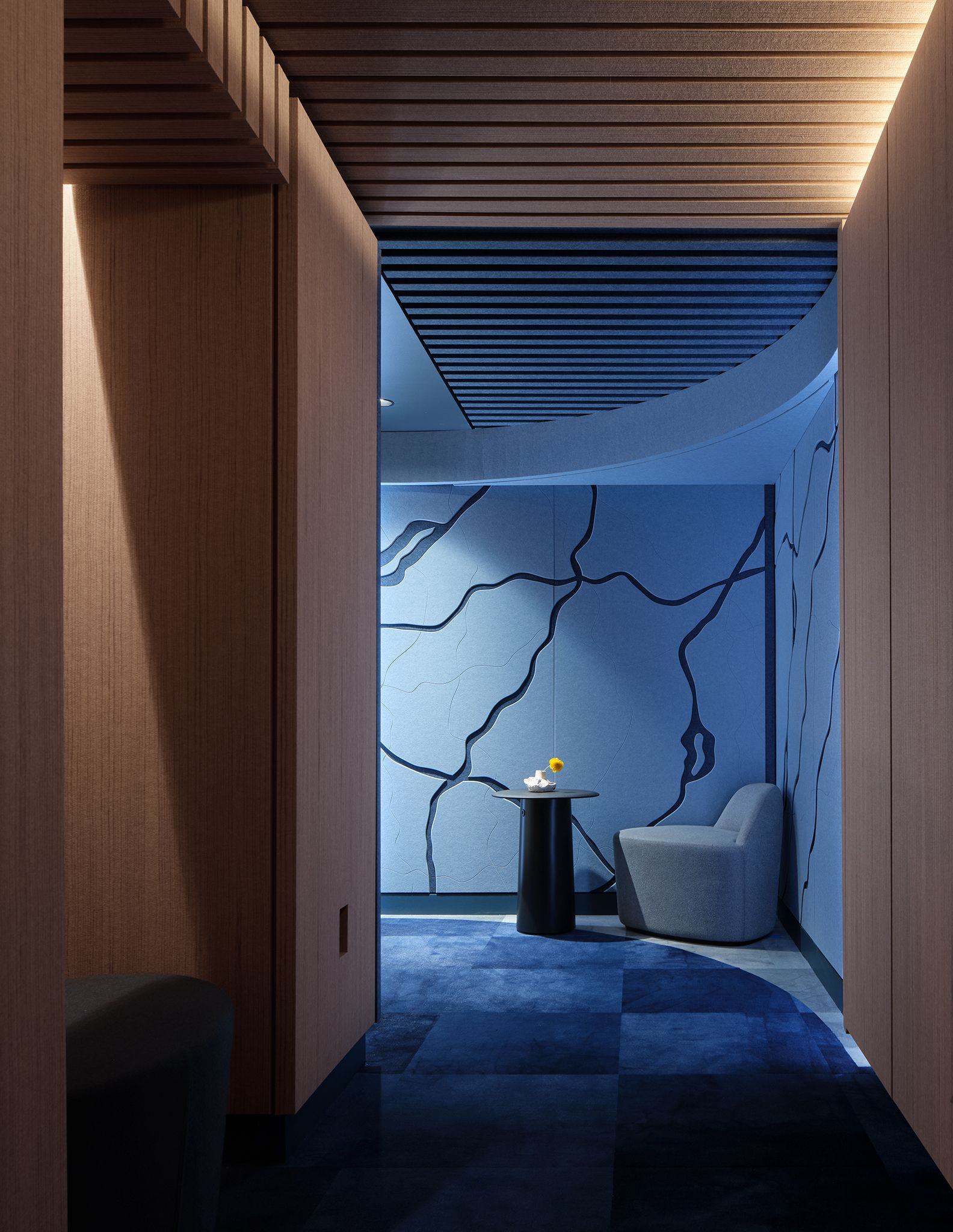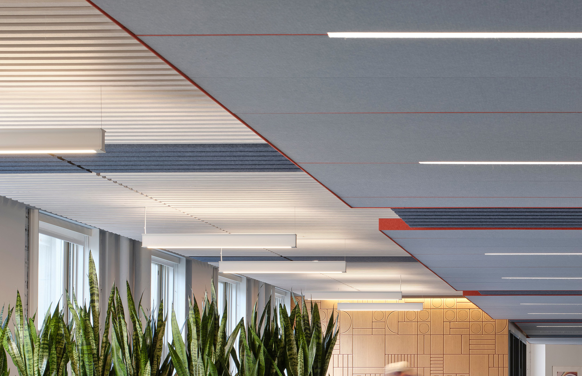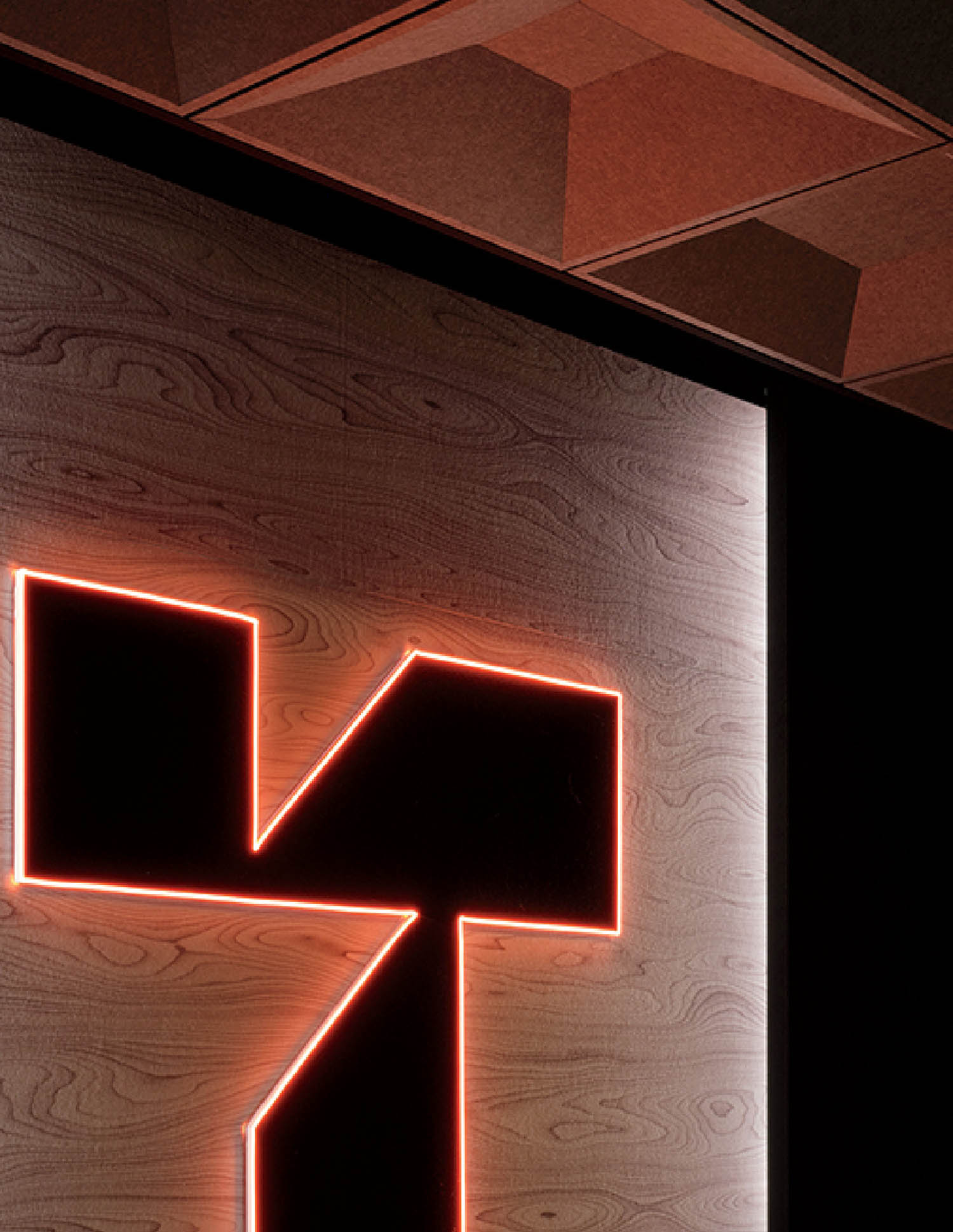 私人办公室同样考虑了视频会议场景的需求。墙面巧妙陈列Turf的声学解决方案,既是吸音功能体,又成为赏心悦目的视频会议背景。一处点睛之笔在于定制化的Turf装置,将管道系统匠心独运地转化为兼具建筑美感与导视功能的视觉元素。