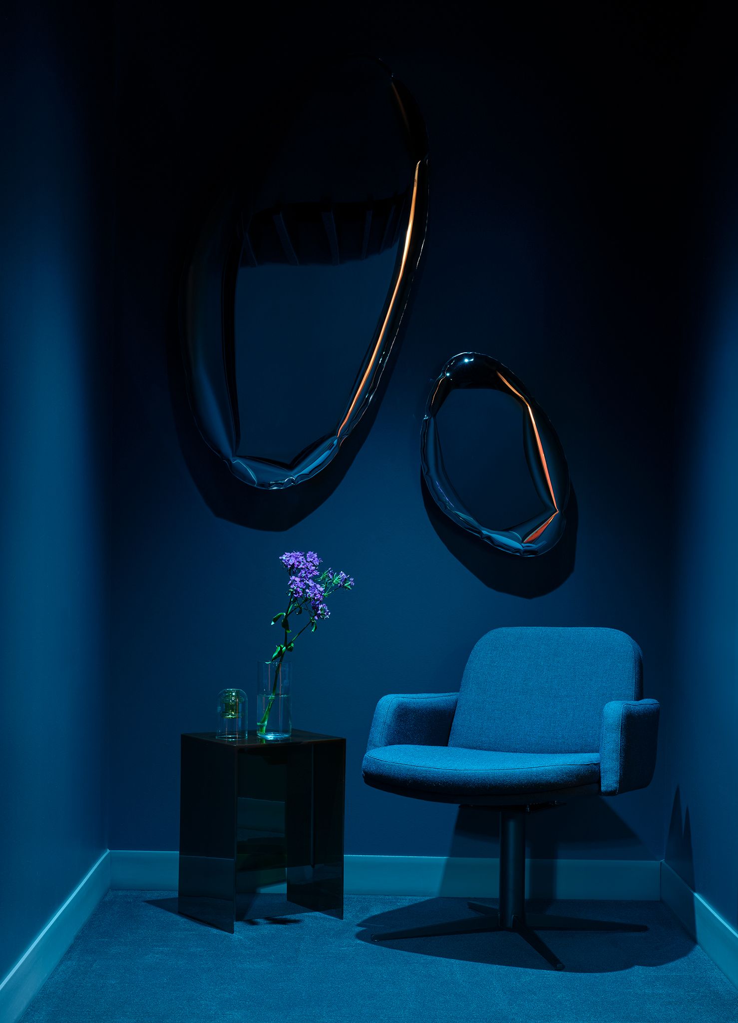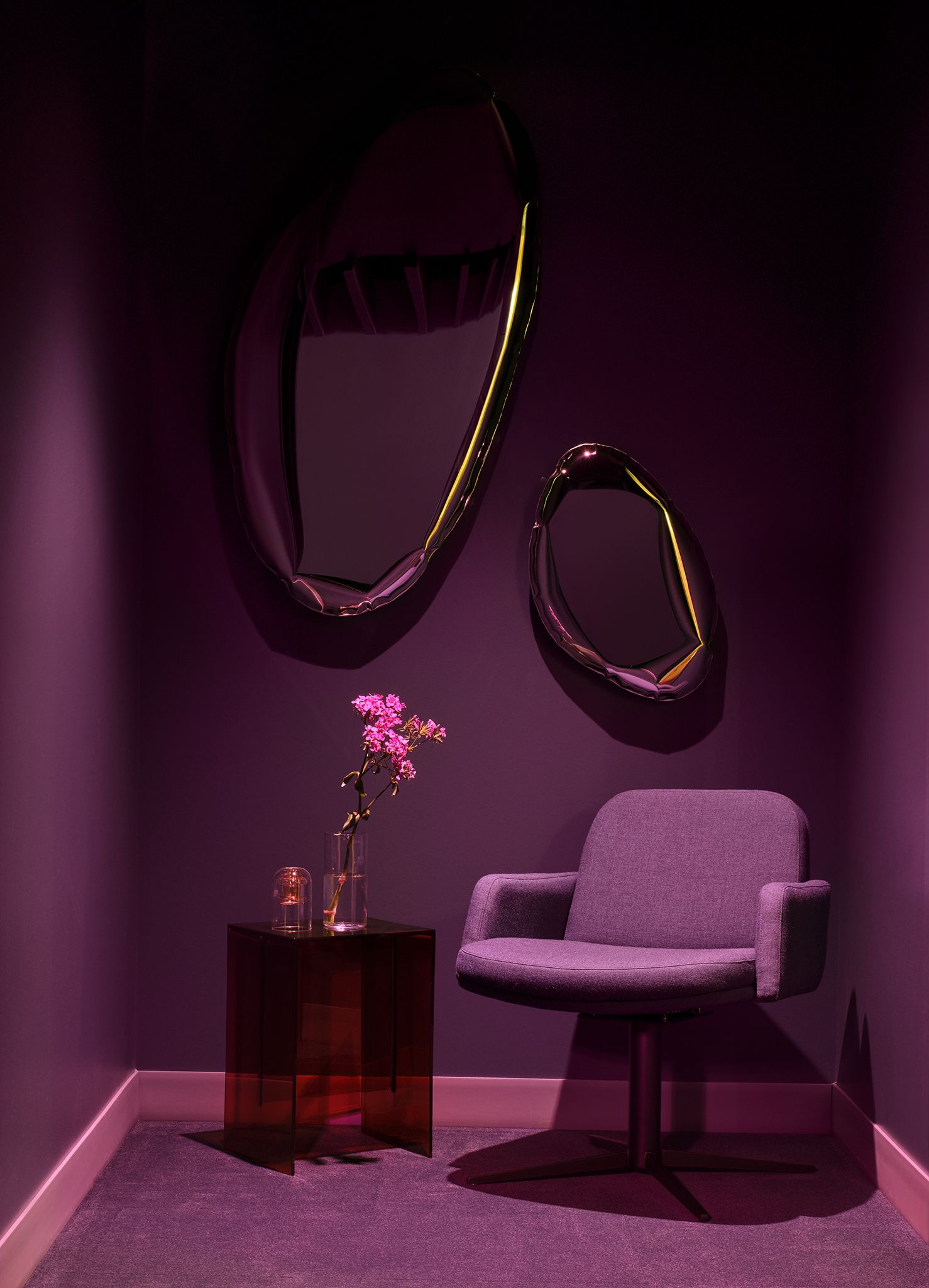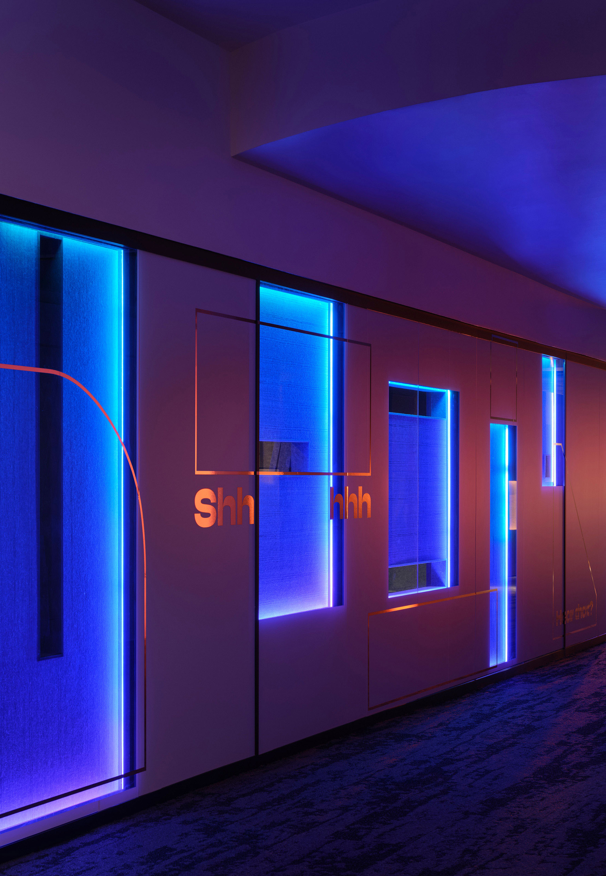 展厅为访客打造了一场沉浸式探索之旅,通过两条风格迥异的“路径”,全方位展现创新材料的无限可能,演绎Turf产品的多元魅力。步入其中,访客将面临一次自主选择——穿越入口门廊,开启个性化的体验之旅。一侧是活力洋溢的明快路径,洋溢着玩趣盎然的亮粉美学;另一侧则以深邃神秘的暗调氛围,构筑起私密亲和的沉浸场域。两条路径本身就是一场序章,引领人们感知Turf产品通过不同选择与应用所能营造的广阔情绪光谱。两条路径两侧均点缀着精致的场景化展示;沿途设置的“对望点”巧妙提供了窥见另一条路径的视角,以此彰显品牌的多面性。