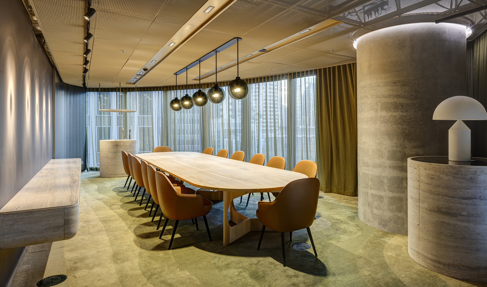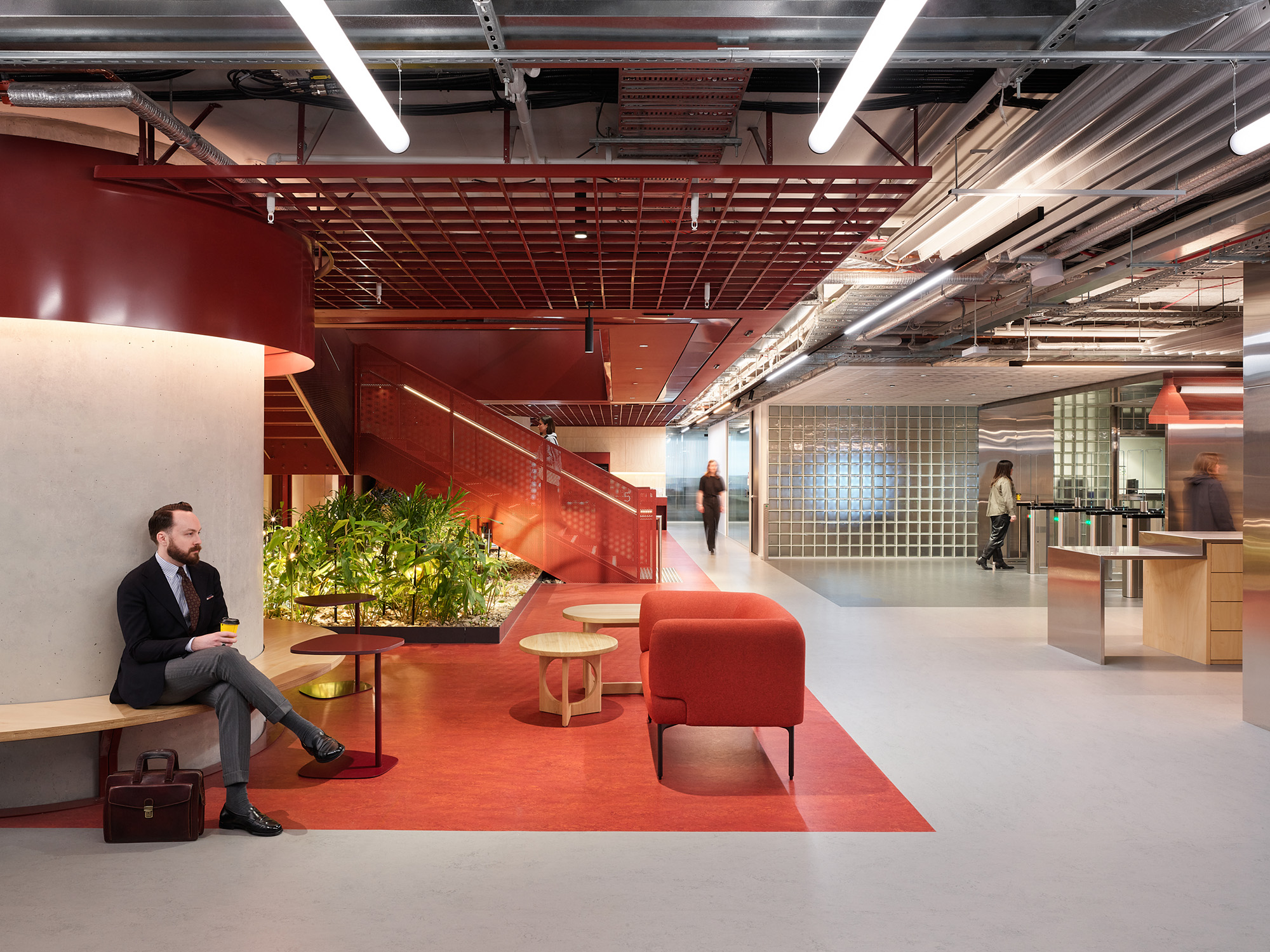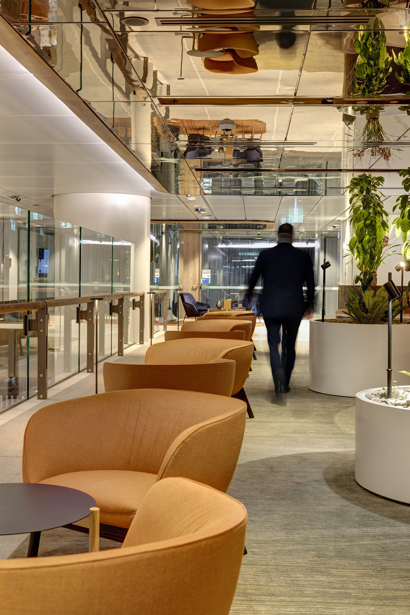 当员工与访客继续在空间中穿行,便会被引入运用了大地色系的建筑核心区域。