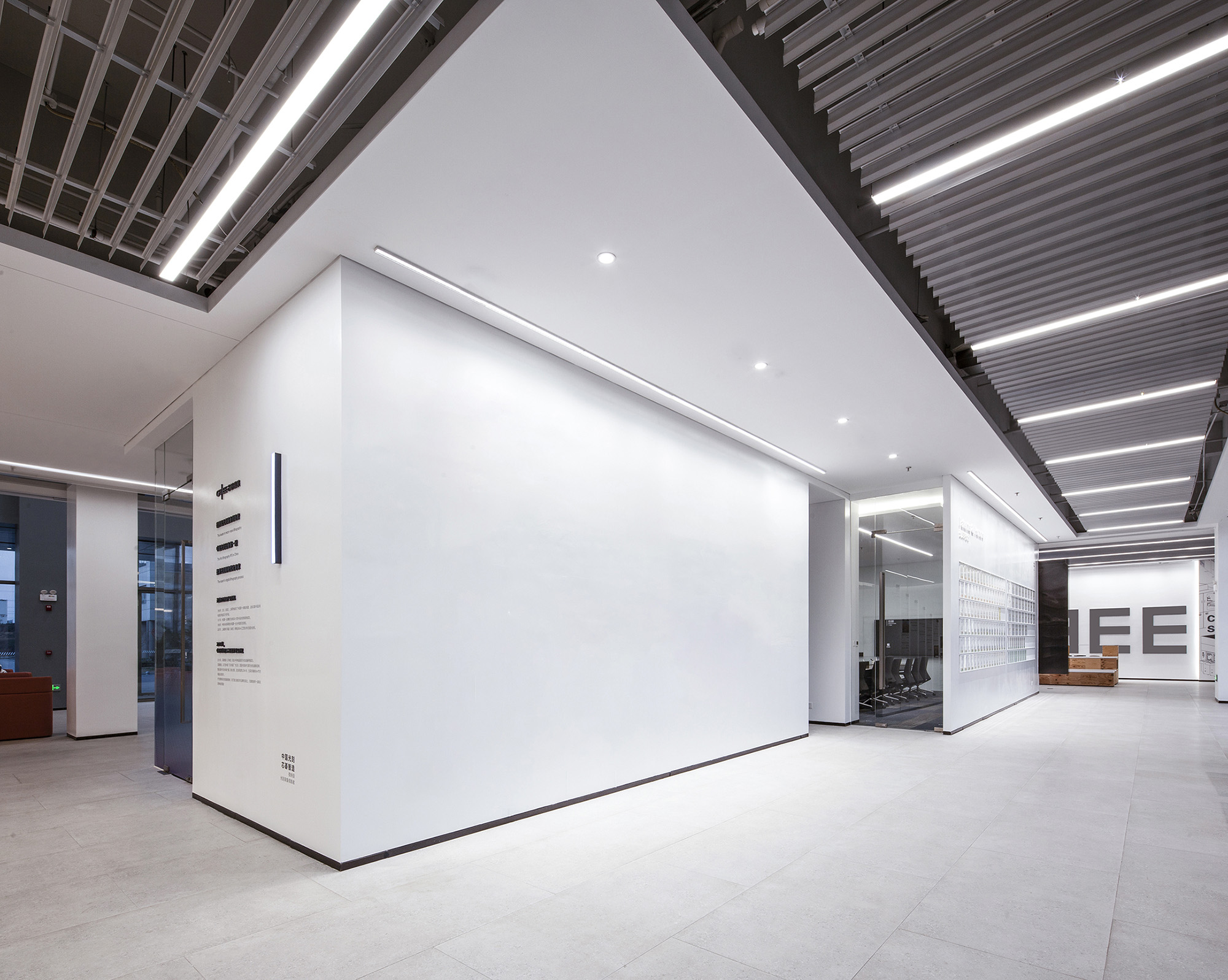 朝向外窗的台阶式分段墙体上,依次布置企业介绍(芯碁)、发展历程、技术专利及分享区等展示模块。开放式的空间布局,让客户接待与参访体验更显灵活友好。