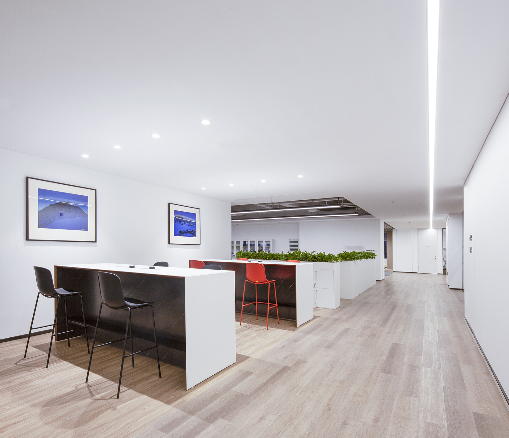 标准办公楼层中,设置了多处可切换使用场景的共享空间,兼具灵动办公与休闲分享功能。空间处理以硬朗洗练为基调,营造出富有速率感与光感的空间氛围,与芯碁的事业特质形成完美呼应。