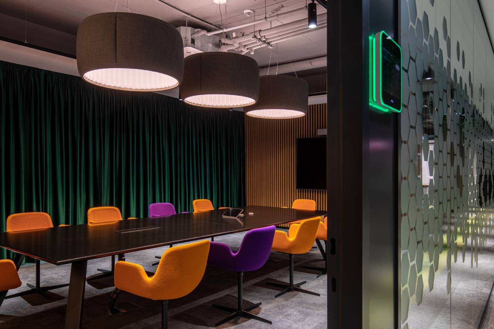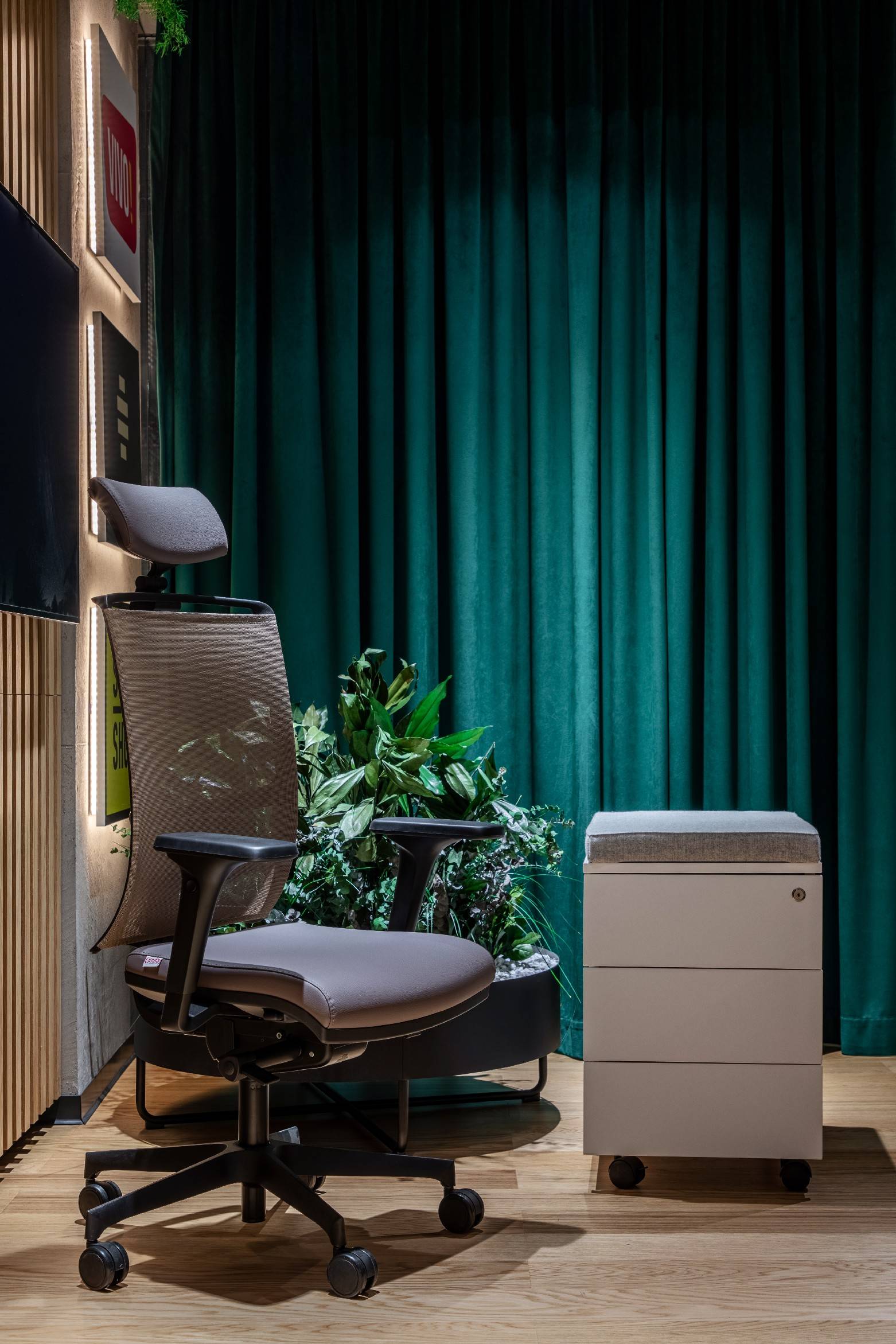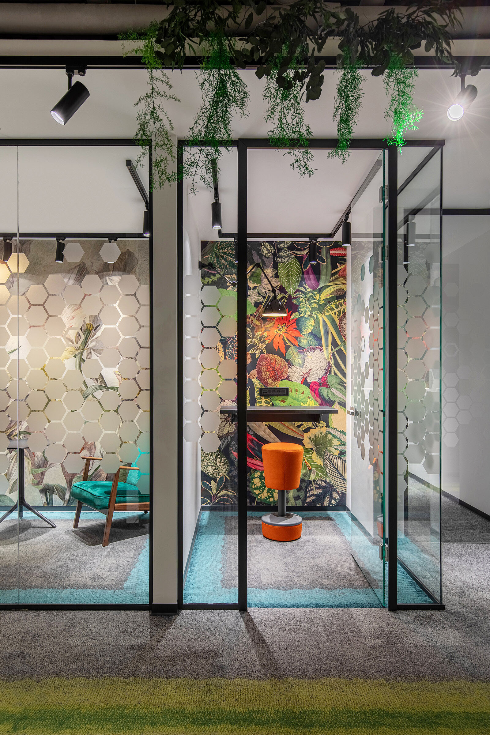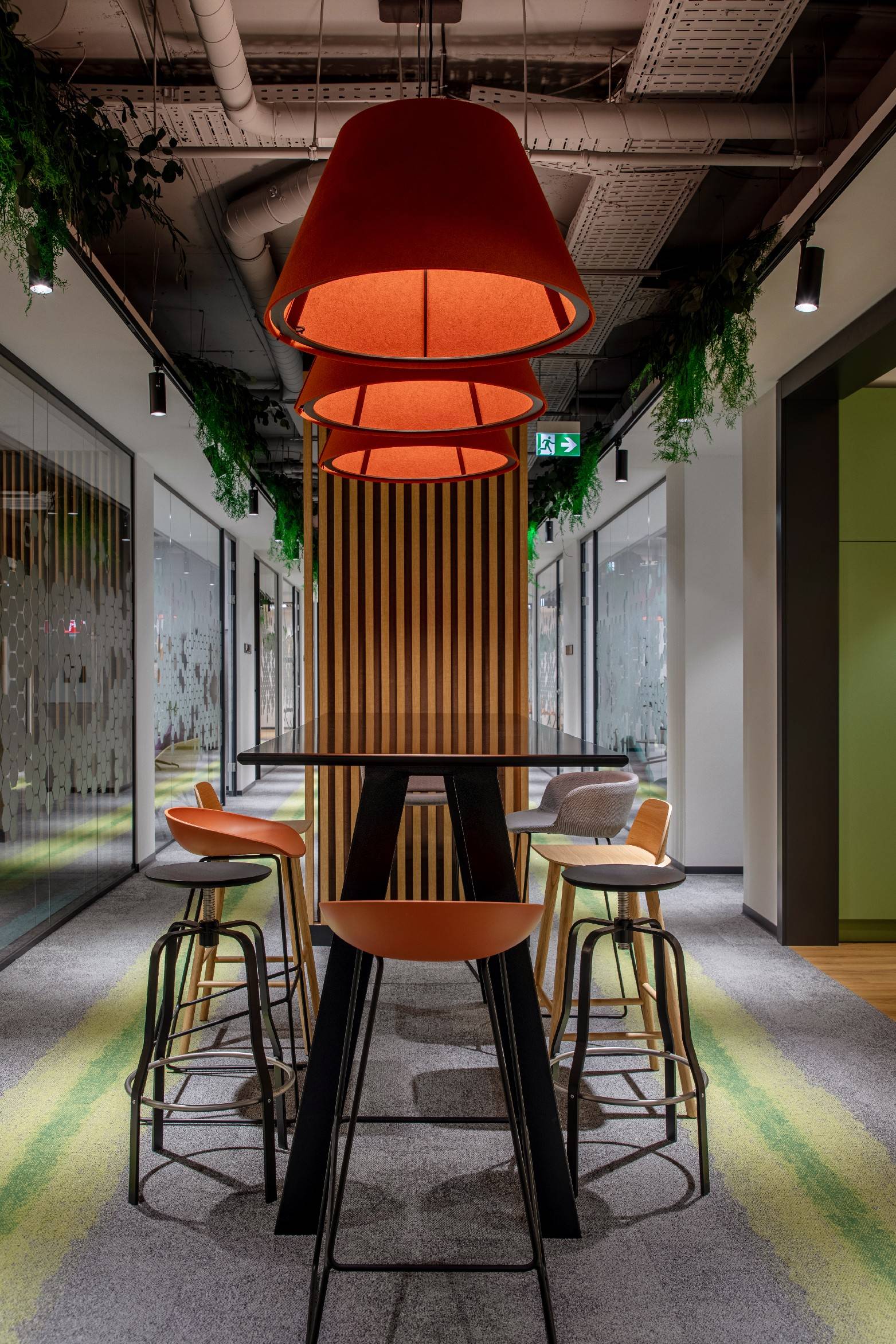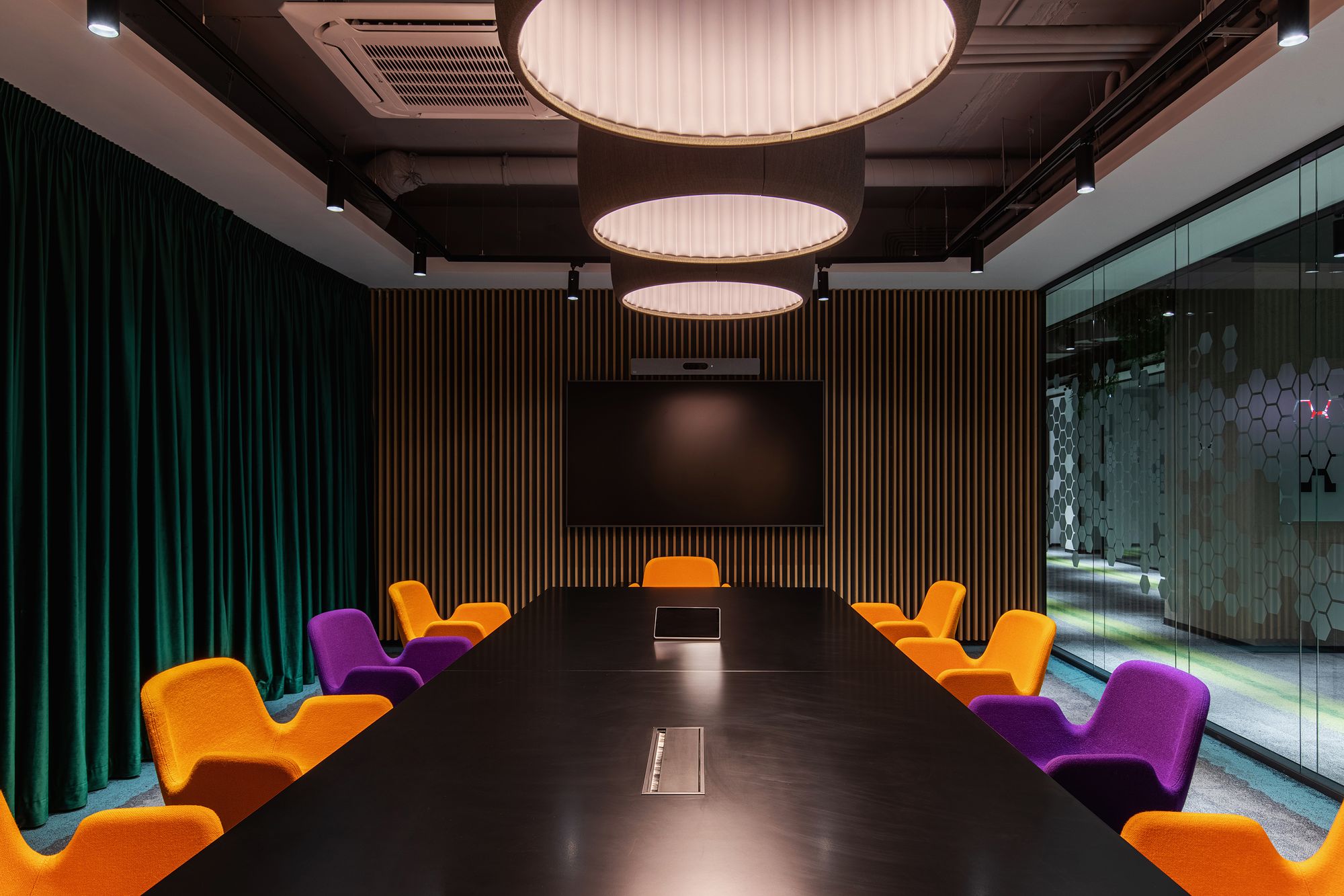 温暖的肌理、金色的点缀和木饰面勾勒出办公室的视觉基调,与冷峻的裸露混凝土表面、灰色调以及局部的黑色金属细节形成鲜明对比。色彩缤纷的装饰元素点缀在特定区域,为整个空间增添了视觉趣味和灵动感。