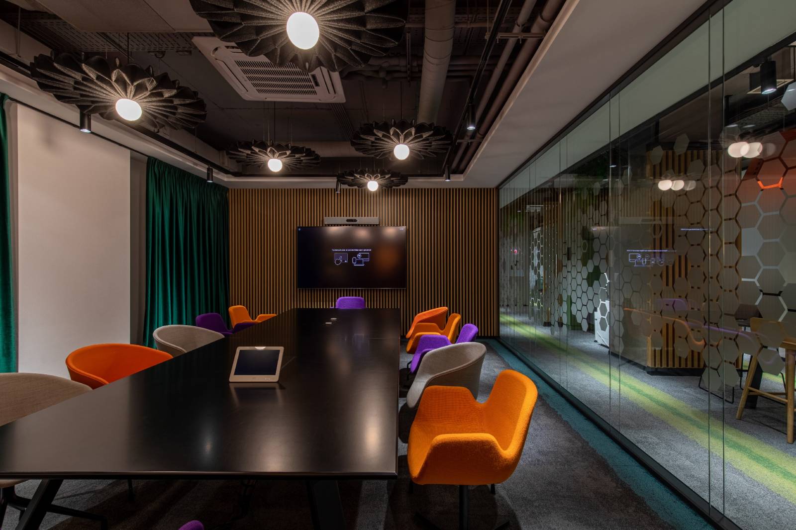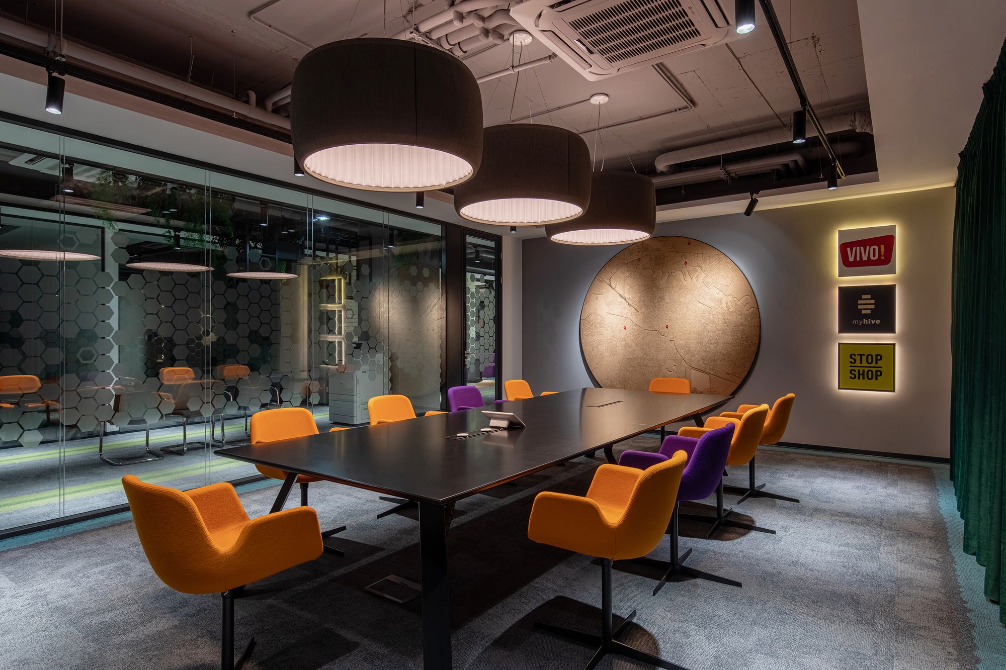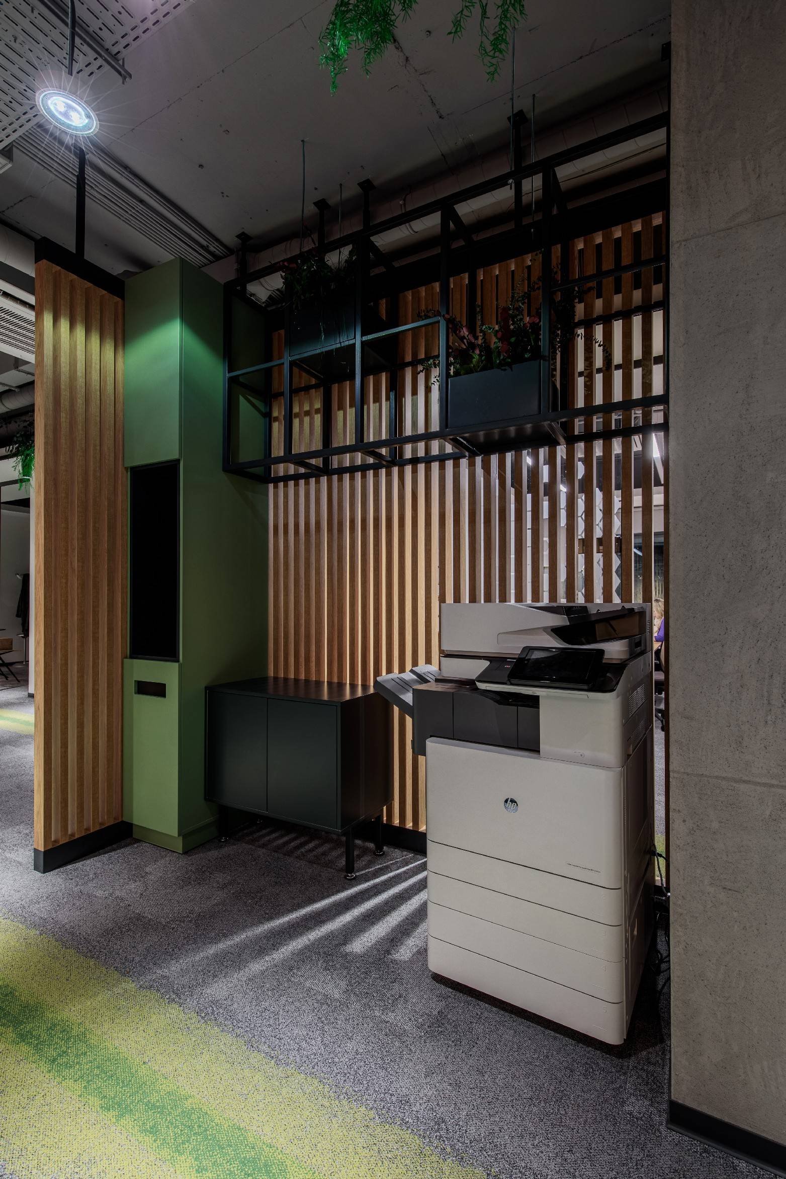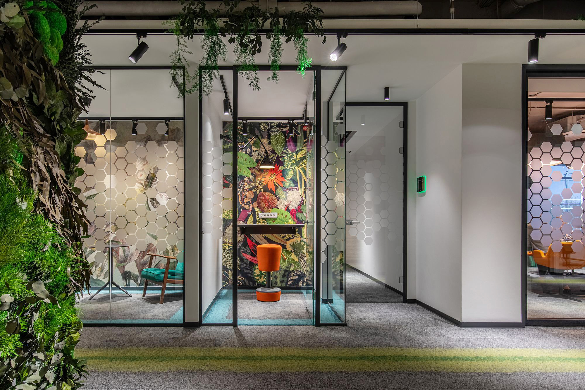 温暖的肌理、金色的点缀和木饰面勾勒出办公室的视觉基调,与冷峻的裸露混凝土表面、灰色调以及局部的黑色金属细节形成鲜明对比。色彩缤纷的装饰元素点缀在特定区域,为整个空间增添了视觉趣味和灵动感。