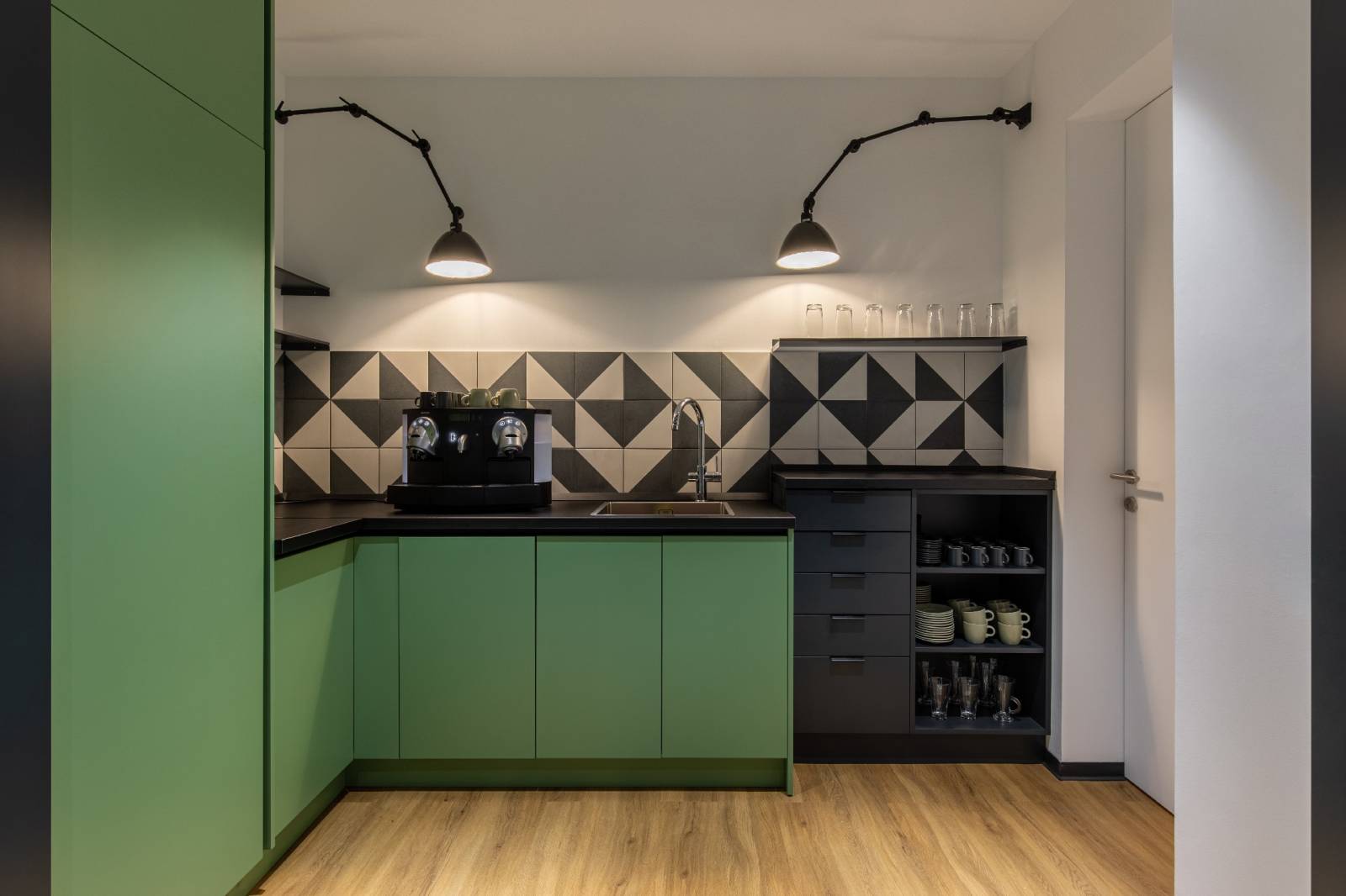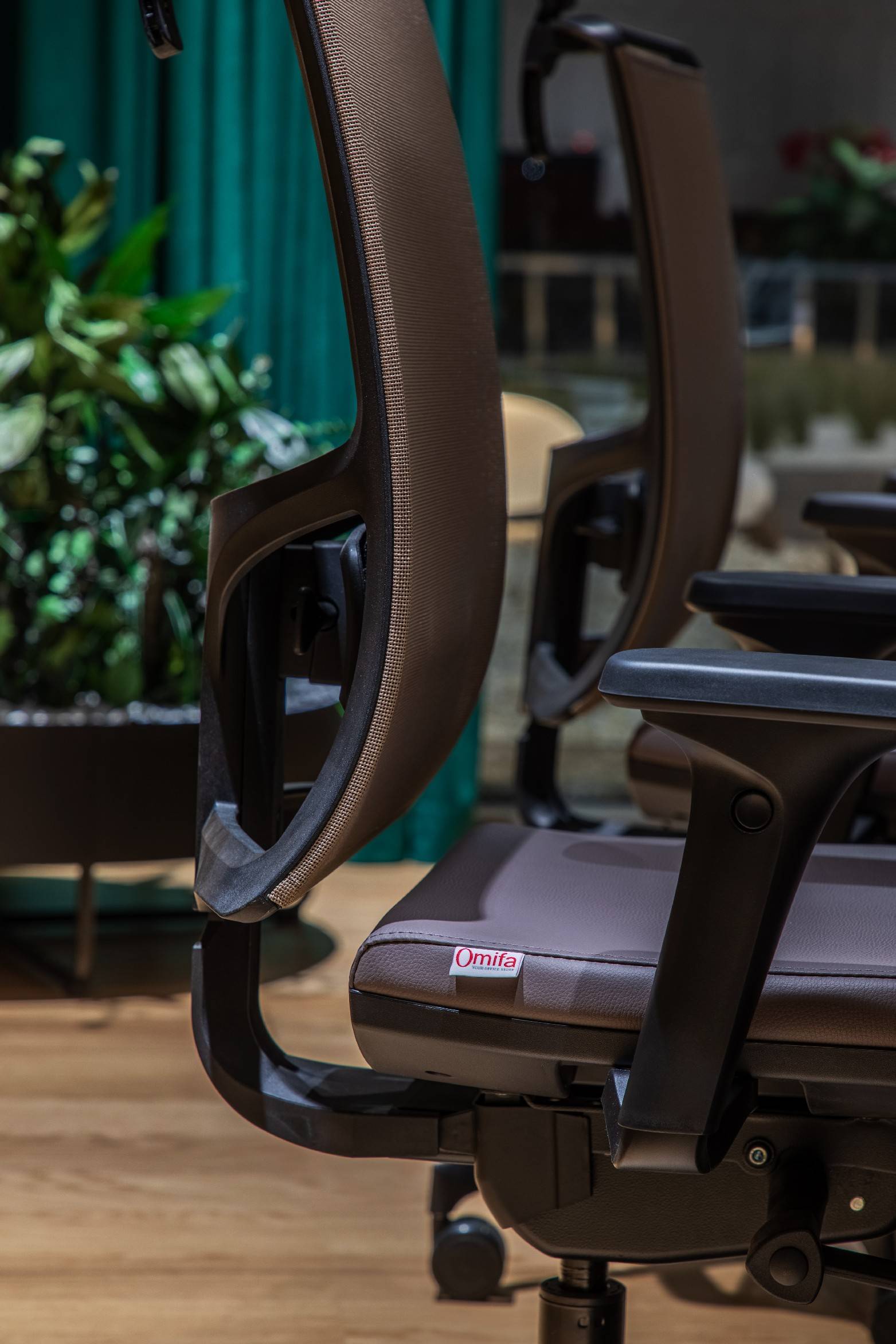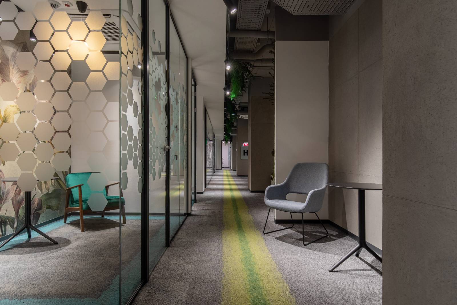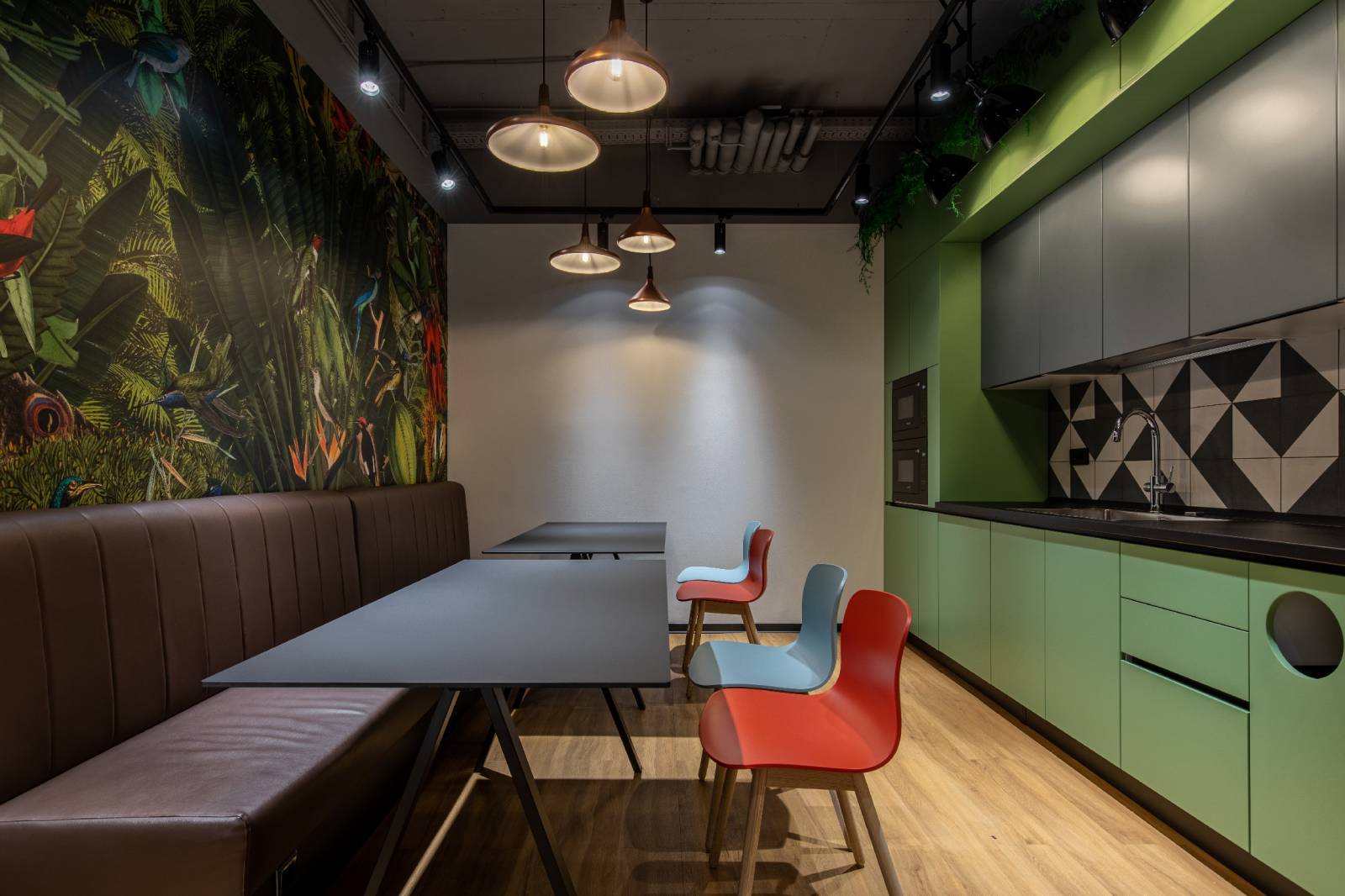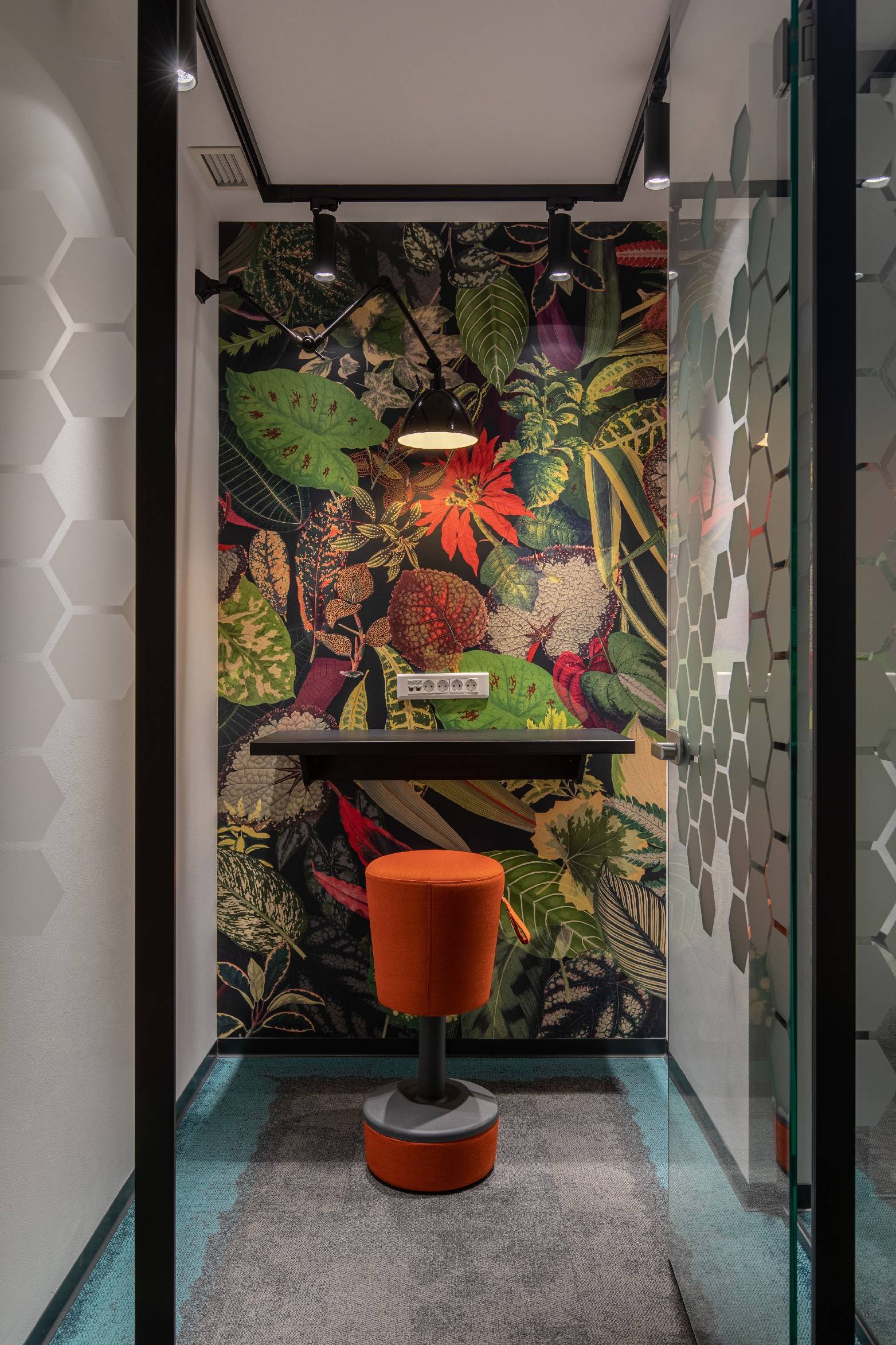 温暖的肌理、金色的点缀和木饰面勾勒出办公室的视觉基调,与冷峻的裸露混凝土表面、灰色调以及局部的黑色金属细节形成鲜明对比。色彩缤纷的装饰元素点缀在特定区域,为整个空间增添了视觉趣味和灵动感。