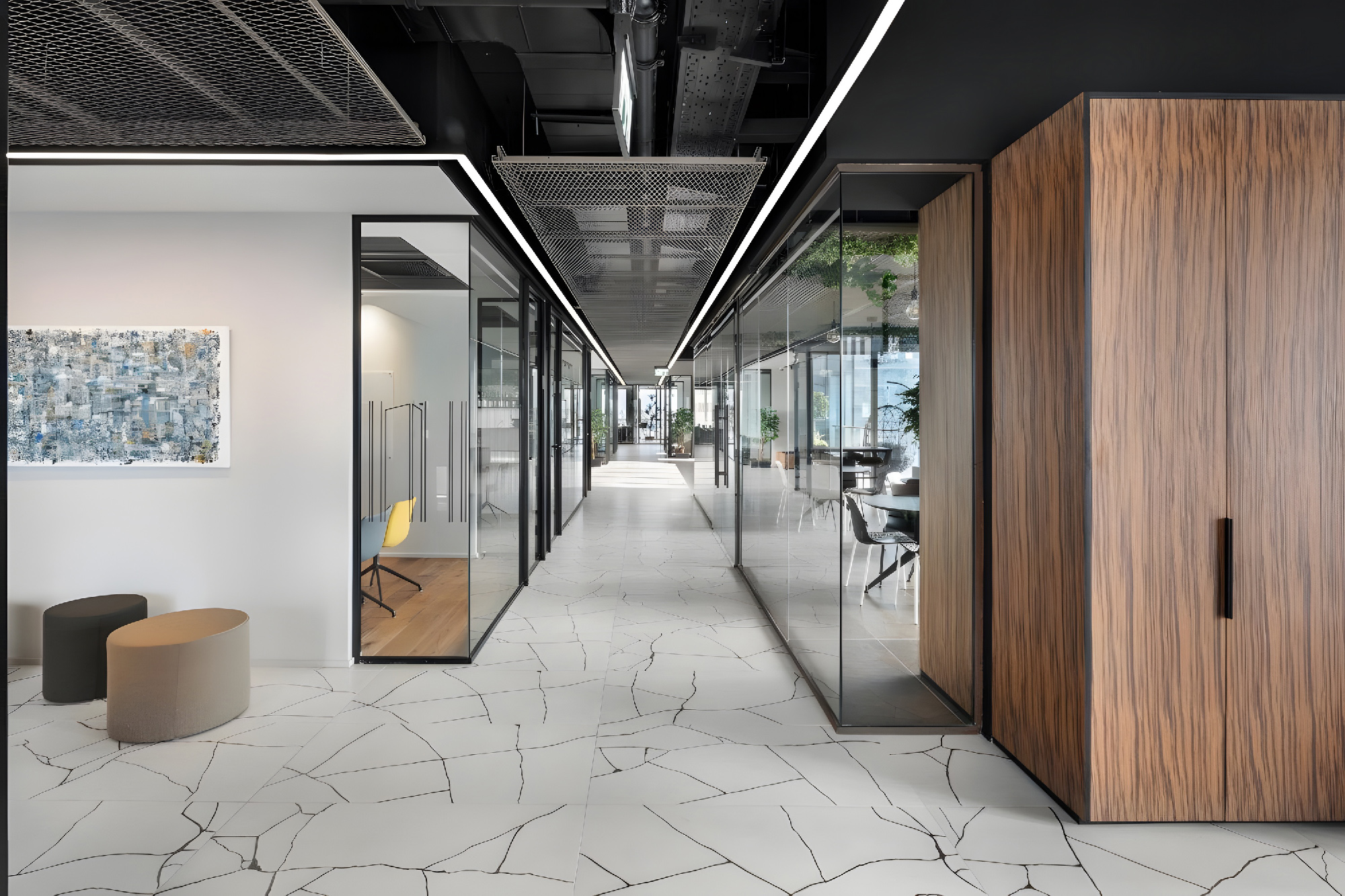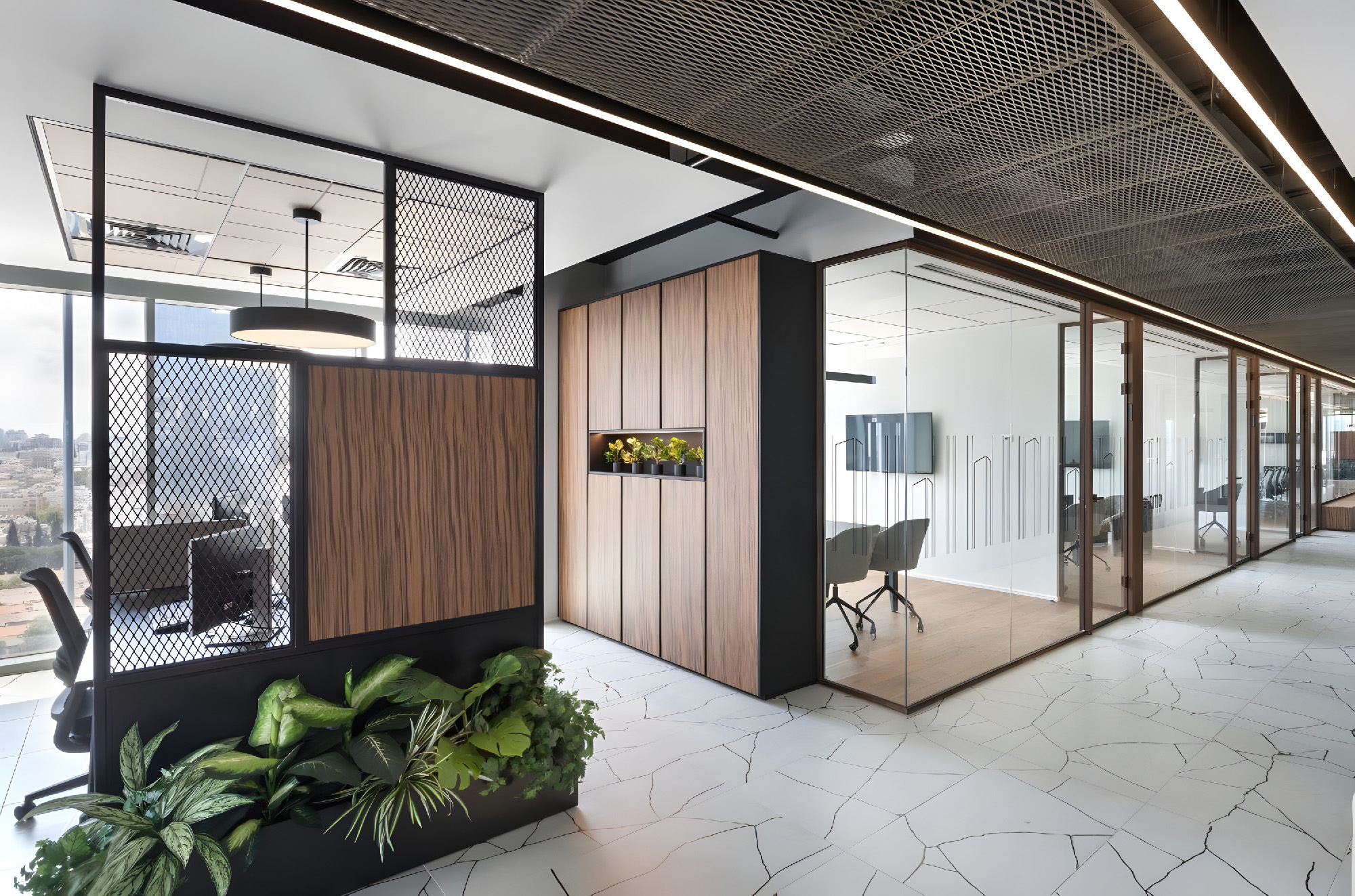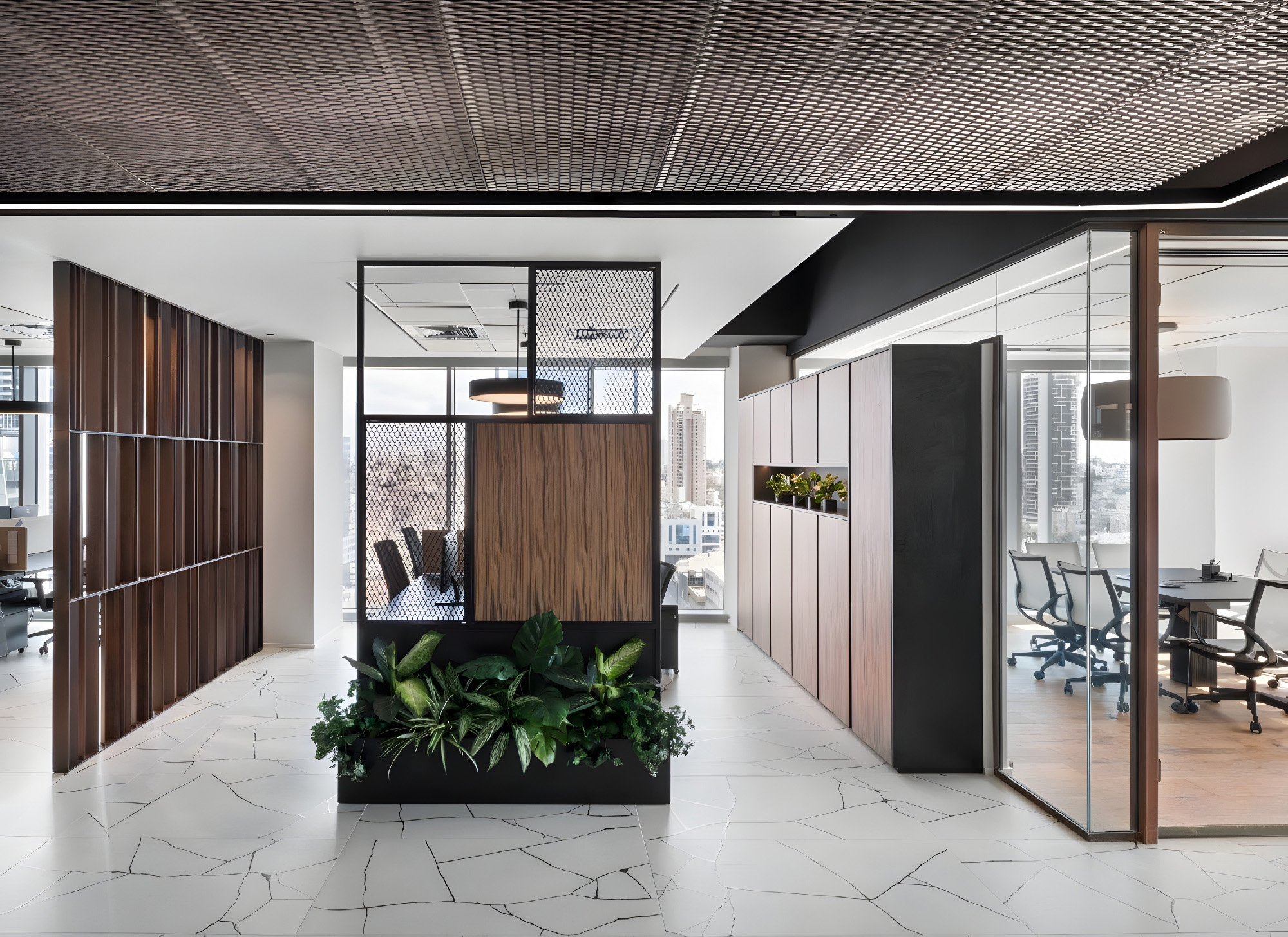 设计运用了丰富的材料,以体现该公司客户群体的特质——其业务聚焦于为建筑项目提供融资支持——空间中采用了耐候钢、金属网、瓷质花岗岩、木材等多种材料。