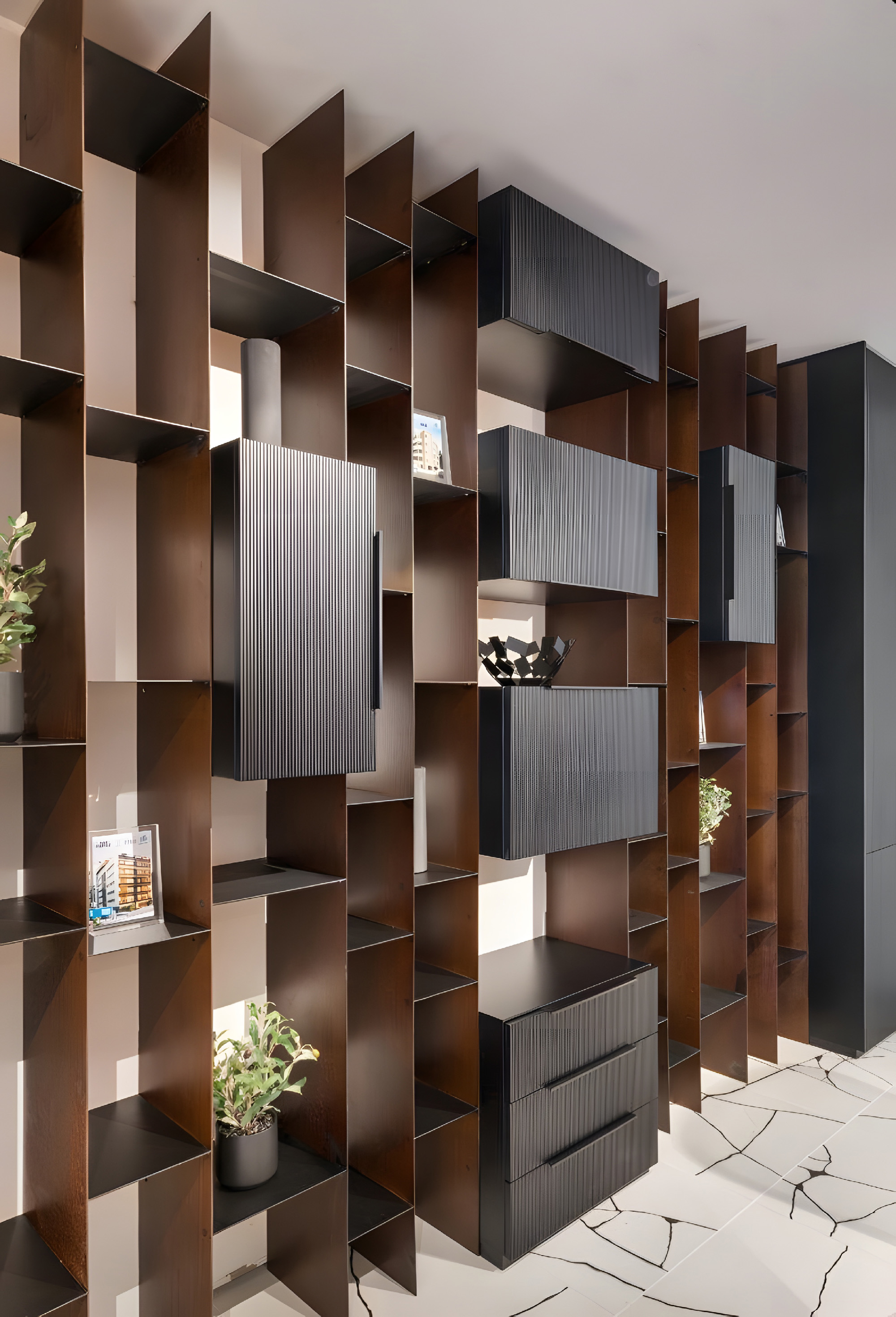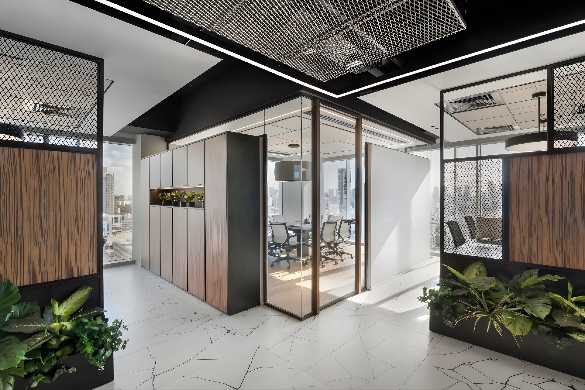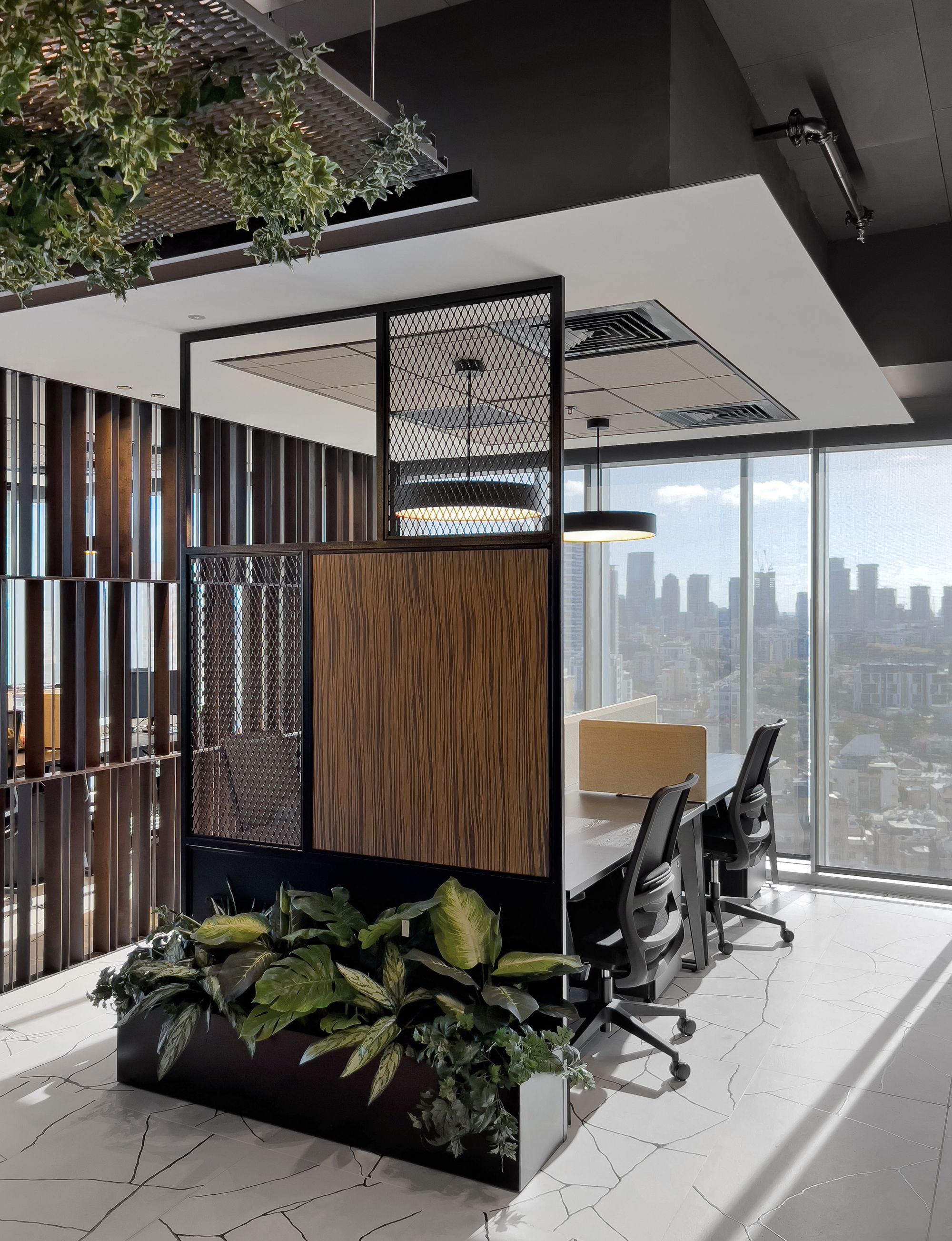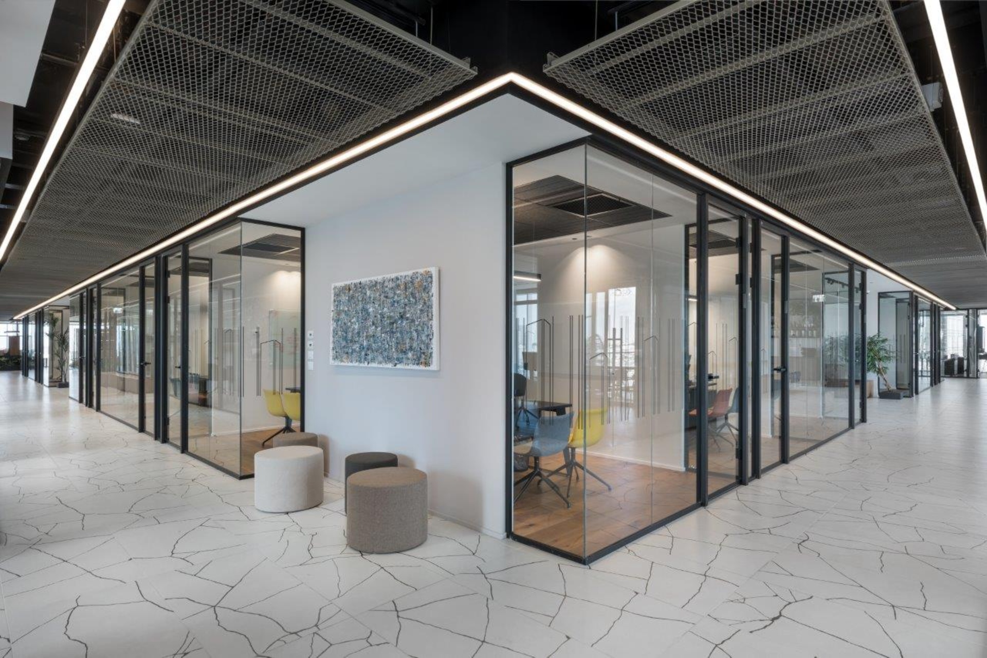 设计运用了丰富的材料,以体现该公司客户群体的特质——其业务聚焦于为建筑项目提供融资支持——空间中采用了耐候钢、金属网、瓷质花岗岩、木材等多种材料。